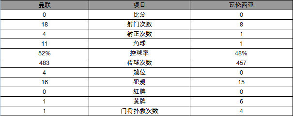 全场比赛,曼联18次攻门4次射正,瓦伦西亚8次攻门1次射正,双方均未入球。曼联控球率为52%,瓦伦西亚则为48%。