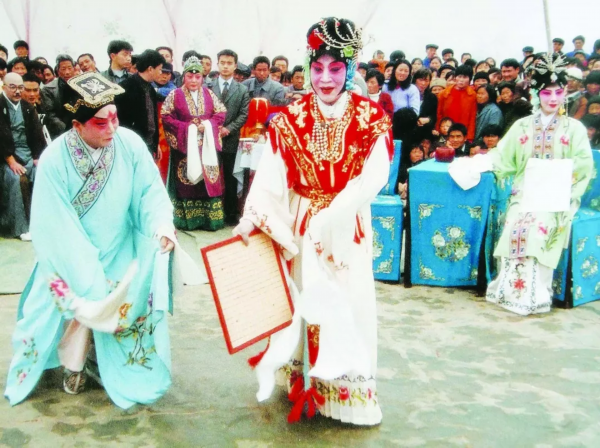 上世纪八十年代,宋长荣(中)积极参加“三下乡”活动,表演一丝不苟。