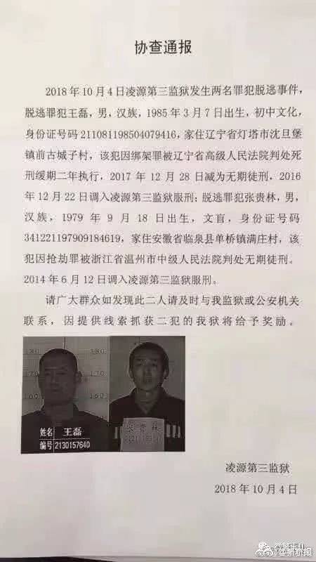 今日,辽宁省朝阳市公安局发布消息称,有两名罪犯从凌源市第三监狱逃脱。公安局发布的协查通报显示,2018年10月4日,凌源第三监狱发生两名罪犯逃脱事件,脱逃罪犯王磊,男,汉族,1985年3月7日出生,初中文化,身份证号码211081198504079416,家住辽宁省灯塔市沈旦堡镇前古城子村,该犯因绑架罪被辽宁省高级人民法院判处死刑缓期二年执行,2017年12月28日减为无期徒刑,2016年12月22日调入凌源第三监狱服刑;脱逃罪犯张贵林,男,汉族,1979年9月18日出生,文盲,身份证号码341221197909184619,家住安徽省临泉县单桥镇满庄村,该犯因抢劫罪被浙江省温州市中级人民法院判处无期徒刑。2014年6月12日调入凌源第三监狱服刑。