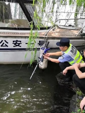 杭州景区公安分局水上派出所民警——“西湖捞哥”周翔军,戴着墨镜驾船赶到,手上提着他发明的第四代“打捞神器”,简单观察了一番“案发现场”,5分钟后,她的手机便打捞了上来,屏幕还亮着。“哈哈这手机质量可真不错,姑娘你赶紧拿去维修店烘干检查,问题应该不是很大!”老周说。