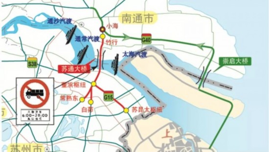 ◎苏通大桥为G15沈海高速苏昆太枢纽(1243K)至董滨枢纽(1218K),限行里程为25公里;G15w常台高速常熟东互通(9K)、S5常嘉高速白茆互通(4K)至G15沈海高速竹行互通(1189K),限行里程为42公里,两段合计67公里。