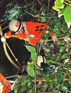 确定了邵先生的具体位置后,救援民警和青城前山景区管理处工作人员第一时间赶往天师洞附近的齐云阁前岩下,在深达20米的山崖处找到了受困的邵先生。救援人员将安全绳系在腰间,顺着山崖向下,抵达邵先生身边后,为其系上安全绳、戴上头盔,将其救助上山。随后,民警又用滑杆将邵先生抬至山门外早已等候着的120救护车上。