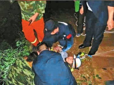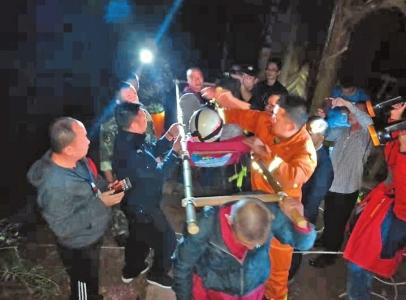 救援人员第一时间在天师洞附近的齐云阁前岩下,将受困的邵先生救出。图片来源:华西都市报