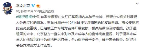 #情况通报#针对有家长报警在大红门某商场内其孩子被抢,质疑公安机关对嫌疑人处理过轻的情况,丰台分局已于10月4日接到涉事家长的复议申请。市公安局对此案高度重视,已组成工作专班对案件开展复核,相关结果将及时通报。孩子是祖国的未来,北京警方一直以来对涉及未成年人的案件高度重视,对于侵害未成年人的违法犯罪行为依法严厉打击,全力保护孩子安全、维护家长权益。欢迎社会各界对警方工作监督。
