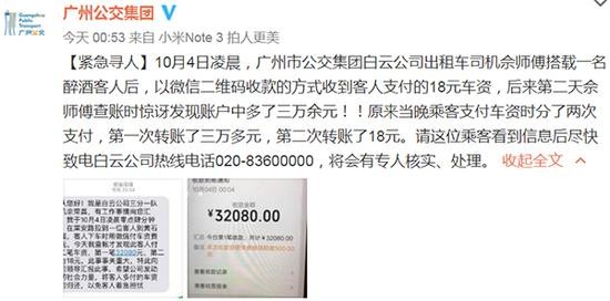 10月5日,一则“广州的哥紧急寻找多付3万余元车费乘客”的消息在网络热传。当日下午,澎湃新闻从广州公交集团白云公司工作人员处了解到,该消息属实,目前涉事乘客尚未找到。