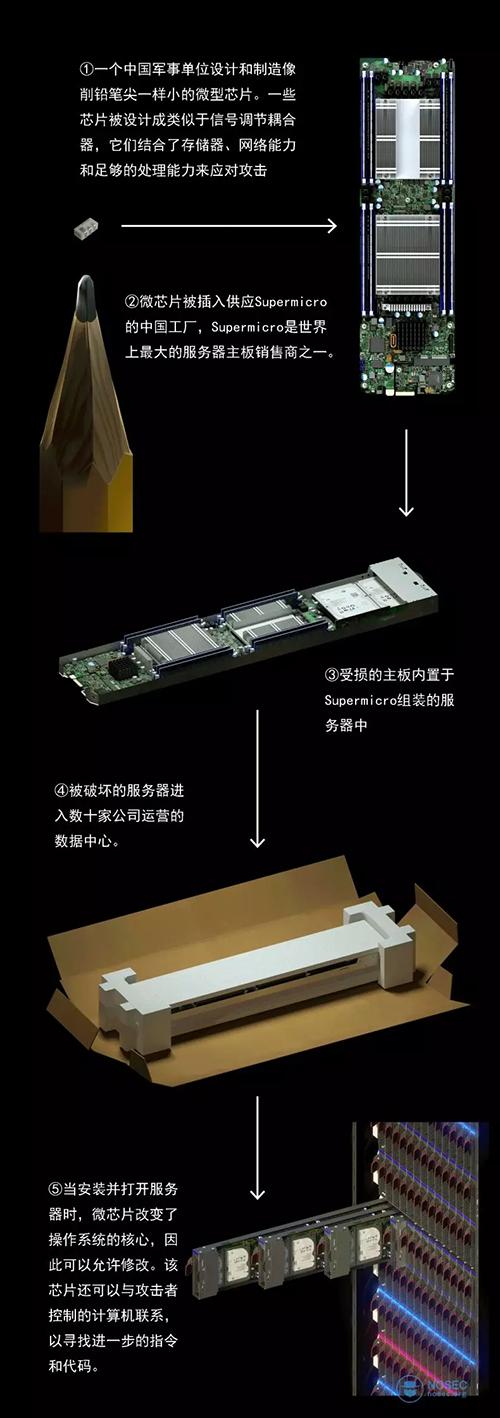 在《彭博商业周刊》发表的这篇《大黑客:中国如何利用微型芯片渗透美国公司》的报道中,中国特殊部门通过向 Supermicro(美国超微公司,一家大型服务器生产商)在中国的制造商施压,使其在为 Supermicro 生产的主板中偷偷嵌入一枚像削尖的铅笔芯尖端一样大小的所谓芯片,而这一伪装成“信号调理耦合器”的芯片随着主板进入Supermicro 的组装的服务器,逃过了重重安全检查,销售入近30家美国公司、机构。