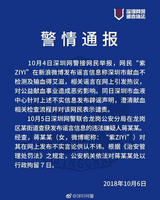 【网民“紫ZIYI”传播深圳市献血不检测、输血得艾滋谣言 被处以行政拘留7日】深圳网警提醒:网络空间也必需遵纪守法,互联网上的信息具有传播速度快、覆盖范围广等特点,散布虚假信息可能造成难以估计的恶劣影响,网上造谣必将承担法律责任。