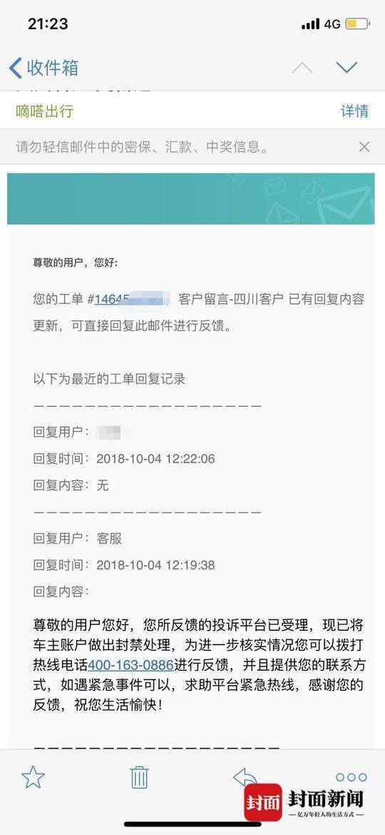 就此,刘女士向该平台客服反映了情况。18个小时过后,也就是10月4号中午,刘女士得到的平台邮件回复称,已经对该车主帐号进行封禁处理。
