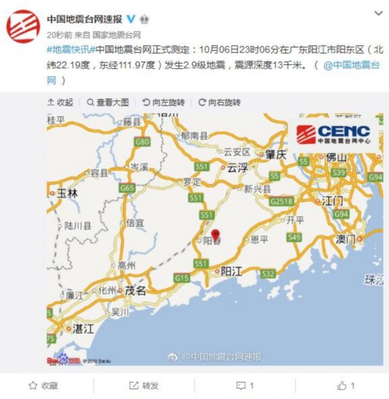 中新网10月6日电 中国地震台网正式测定:10月06日23时06分在广东阳江市阳东区(北纬22.19度,东经111.97度)发生2.9级地震,震源深度13千米。