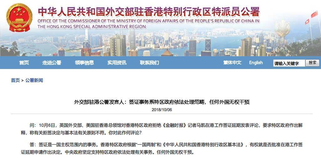 问:10月6日,英国外交部、美国驻香港总领馆对香港特区政府拒绝《金融时报》记者马凯在港工作签证延期发表评论,要求特区政府作出解释,称有关拒签决定与基本法有关原则不符。你对此作何评论?