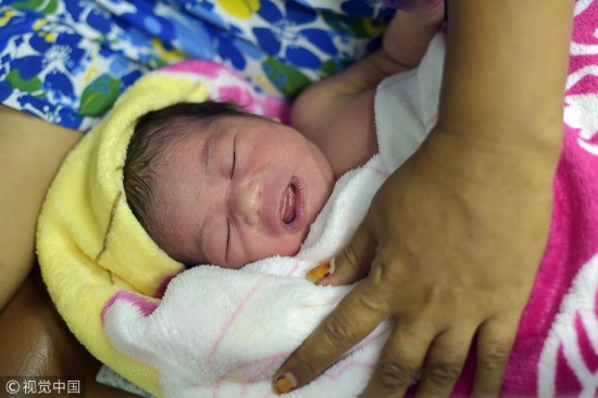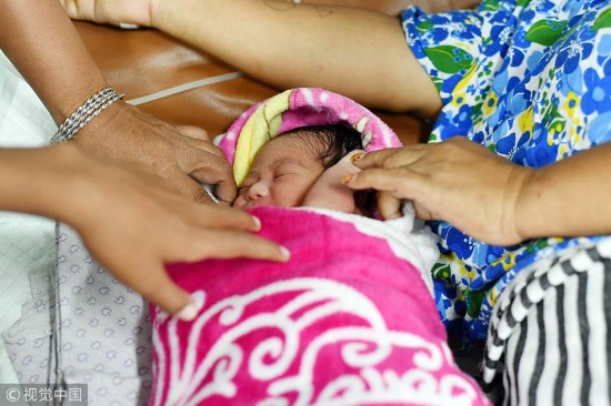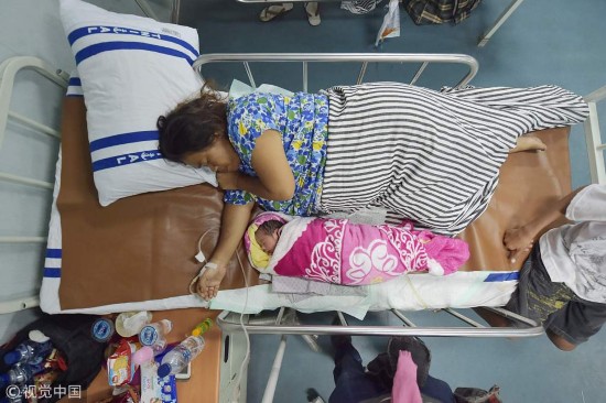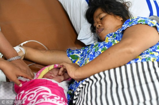 当地时间2018年10月6日,印尼潘托罗安,一位38岁的妇女在地震灾区的“苏哈托博士”号(KRI Dr Soeharso)医院船上照顾她的新生儿。印尼中苏拉威西省9月28日发生强烈地震和海啸,目前已造成1571人死亡。
