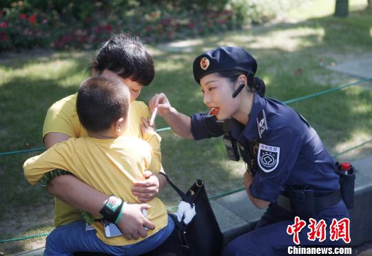 图为:西湖女子巡逻队队员用小礼物哄小游客开心。王潇婧 摄