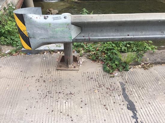 澎湃新闻在垛子岭隧道看到,出口右侧地面上的血迹清晰可见。