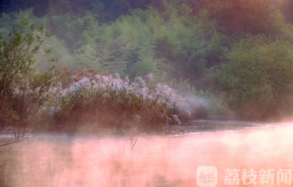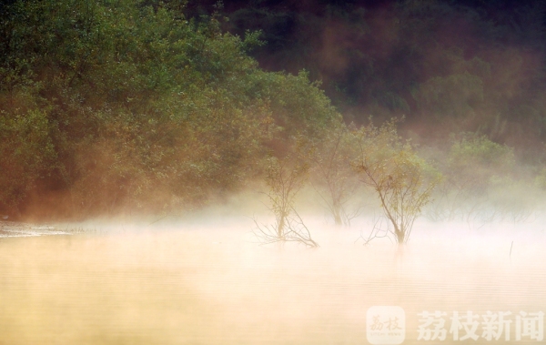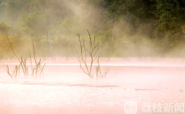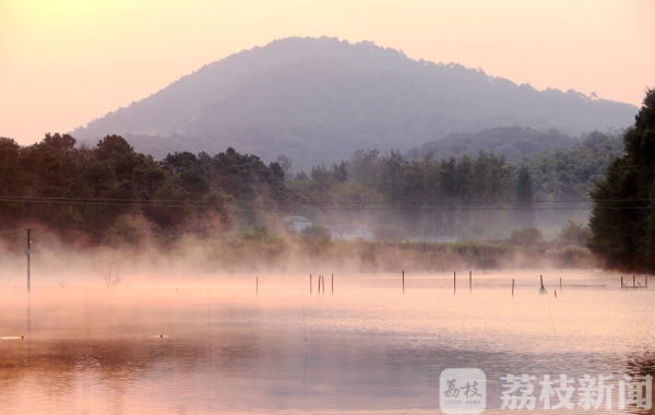 清晨时分的山林格外寂静,荔枝网友在这里看到:水面上弥漫着一层淡淡的水汽,远处的山峦在薄雾中若隐若现,呈现出一种朦胧模糊的美感。