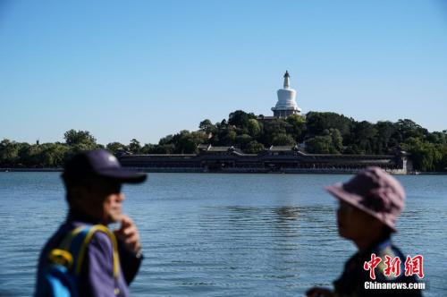 10月6日,北京迎来大风天气。图为游人在北海公园游玩。中新社记者 崔楠 摄
