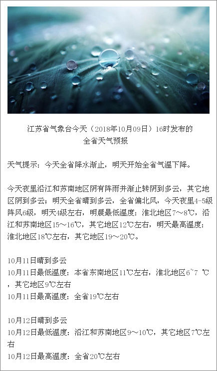 根据江苏气象的最新消息,10月10日开始全省气温下降啦!9日夜里沿江和苏南地区阴有阵雨并渐止转阴到多云,其它地区阴到多云;10日全省晴到多云,全省偏北风,9日夜里4-5级阵风6级,10日4级左右。