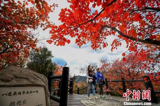 中新网北京10月9日电 (记者 于立霄)连日来北京持续降温,八达岭国家森林公园红叶岭景区5万余株黄栌、元宝枫等彩叶树种大多已经变色,游客穿梭在林间小道,既能近距离观赏红叶,也能远望红叶长城的壮观奇景。最佳观赏期将持续到10月底。