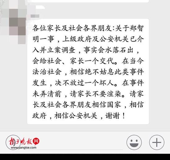 该网友表示,希望能够让郑智明得到严惩,不再祸害更多的孩子,并在文末张贴了疑似家长之间的聊天记录,以及涉嫌猥亵学生的老师对家长的道歉短信,道歉短信中多次对家长说自己是“身处异地他乡的打工仔”、“跪求高抬贵手”、“跪谢”。