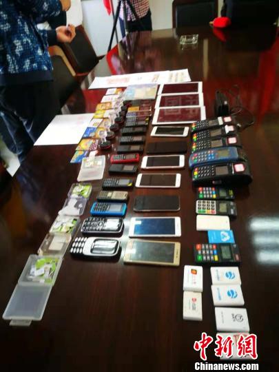 图为犯罪嫌疑人诈骗时所用的手机、手机卡、银行卡、信用卡、POSS机等工具铺满半张桌子。 刘保国 摄