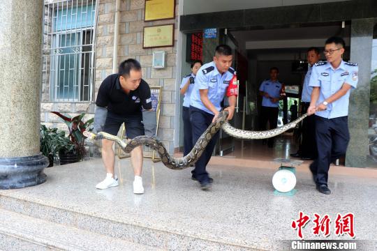 森林公安民警经过2小时努力,成功将这条大蟒蛇“缉拿归案”。抓捕过程中,蟒蛇一阵反胃,将刚吞下的一只鸡吐了出来。