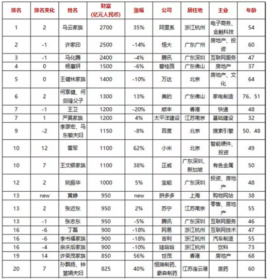 (图为2018胡润百富榜前二十名单)
