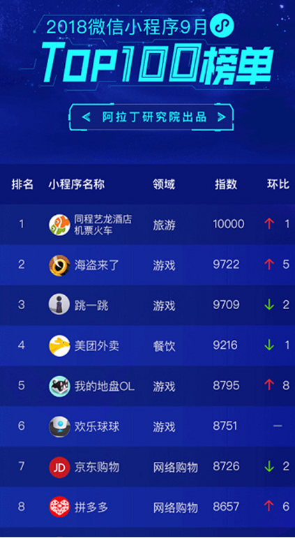 【环球网科技综合报道】10月9日,阿拉丁小程序统计平台发布了9月份微信小程序Top100榜单和报告。从榜单数据来看,同程艺龙酒店机票火车跃居位居月榜单第一名,成功超越霸占阿拉丁指数榜首260天的小游戏“跳一跳”,成为所有微信小程序中的月度榜首。