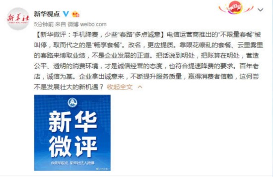 电信运营商推出的“不限量套餐”被叫停,取而代之的是“畅享套餐”。改名,更应提质。靠眼花缭乱的套餐、云里雾里的套路来博取业绩,不是企业发展的正道。把话说到明处,把账算在明处,营造公平、透明的消费环境,才是诚信经营的态度,也符合提速降费的要求。百年老店,诚信为基。企业拿出诚意来,不断提升服务质量,赢得消费者信赖,这何尝不是发展壮大的新机遇?