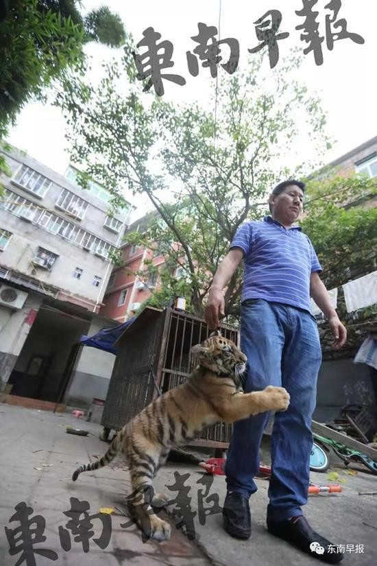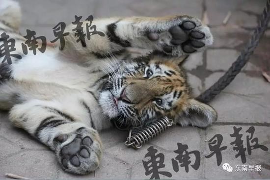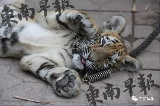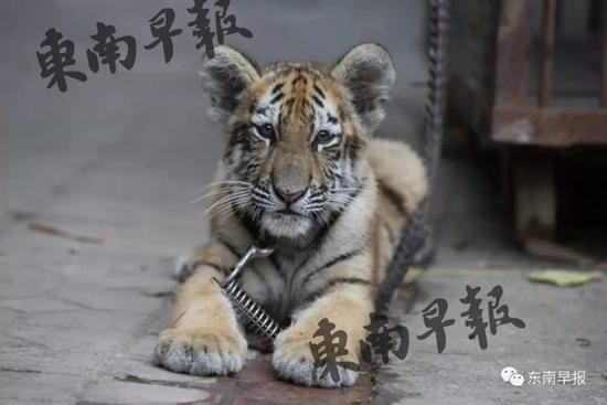 小老虎身在何处呢?等到老孙忙完后,他带着记者来到动物园边上的饲养员宿舍,在宿舍区的小广场处,记者看到,小老虎被绑在一个铁笼子边上,小老虎看到有人进来,显得有点兴奋,手舞足蹈。当记者拿起相机靠近小老虎拍照时,它还会伸出肉嘟嘟的爪子,要抓相机。