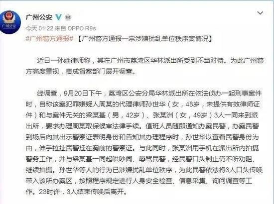 今日凌晨,广州市公安局发布一则名为“广州警方通报一宗涉嫌扰乱单位秩序案情况”的消息。消息称,近日一孙姓律师表示,其在广州市荔湾区华林派出所受到不当对待。为此广州警方高度重视,责成督察部门展开调查。