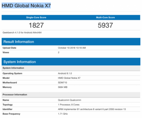 诺基亚X7跑出了单核1827分,多核5937分的分数,作为对比,麒麟970的跑分为单核1900分,多核6200分左右的水平,毫无疑问,诺基亚X7搭载的处理器应该就是次旗舰定位的骁龙710处理器了。