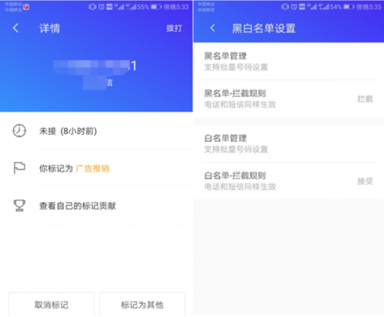 (图:Android用户借助“黑白名单设置”,拦截骚扰电话)