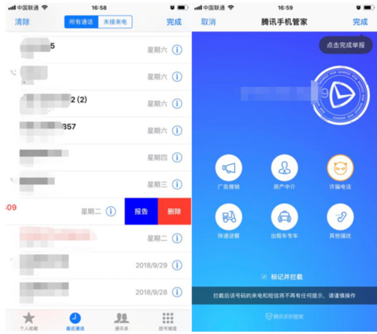 (图:iOS用户安装腾讯手机管家后一键举报骚扰来电)