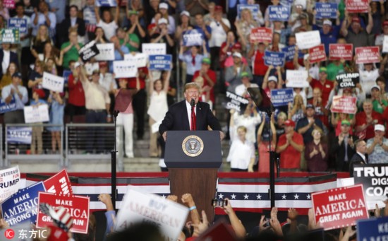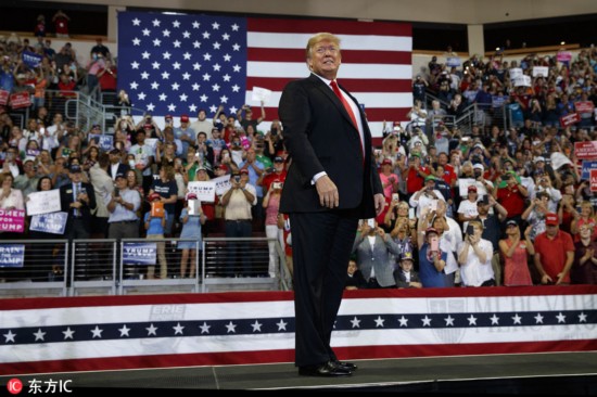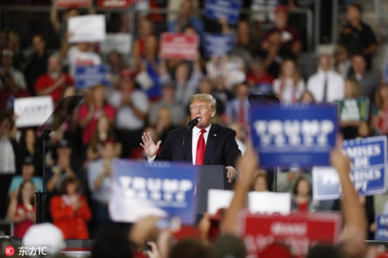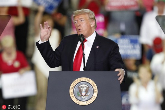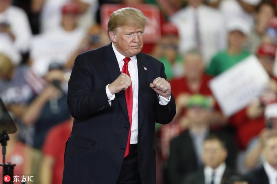 当地时间2018年10月10日,美国宾夕法尼亚州伊利,美国总统特朗普赴宾州举行集会。据报道,周三(10日),美股暴跌,特朗普在宾州表示:“我认为美联储在犯错误,他们(的货币政策收得)太紧。我觉得美联储已经疯了。”当日美股出现大跌,他进一步表示:“实际上,这是我们等待已久的调整,可我真的不赞成美联储现在的行动。”近来,特朗普多次对美联储加息表示不满。