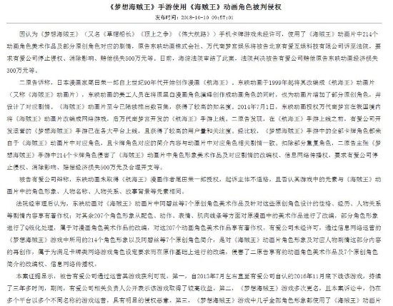 据了解,《梦想海贼王》是一款卡牌类手游,游戏以《海贼王》为题材,是对《海贼王》动画片角色形象及对应人物剧情这部分内容的再创作,属于为满足卡牌类网络游戏角色设定要求而在原作基础上进行的改编,侵害了原告享有的动画角色美术作品及7个原创角色简介的改变权、信息网络传播权。