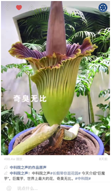 正是认知的一点点累积改变着我们,也改变着世界。中秋时,中科院之声告诉你,当在赏月的时候,我们到底在欣赏什么;当我们谈论“塑料姐妹花”时,它让我们见识桉树的“塑料亲情”;或者干脆用直接醒目的弹幕隆重介绍那些出场“自带标签”的植物,比如巨魔芋就是“臭臭臭”,一些美丽的蘑菇就是“毒毒毒”。