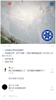 而介绍我国著名天文学家、“中国天眼”的发起者和奠基人南仁东的作品《关于“天眼”,你至少要知道这些》,获得了将近68万点赞,大家在纷纷为这位时代楷模致敬的同时也知道了世界上最大的单口径射电望远镜在贵州,了解了天眼的价值和对科学发展的意义。