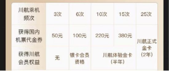 值得一提的是,本次川航会员合作大大降低了飞猪F1会员享受高等级会员福利的难度,只需在挑战期内完成相应乘机次数,F1会员也可以获得川航金银卡和机票抵用券,尽享丰富出行特权。