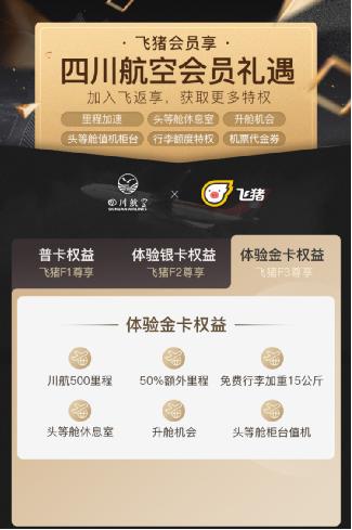 相隔仅半月,飞猪与全球大牌会员打通又下一城。10月11日,飞猪宣布与四川航空(下简称“川航”)完成会员打通,不同级别的飞猪会员在川航旗舰店完成一次购票后,即可领取对应的川航普卡、体验银卡或体验金卡,并获得额外500川航里程奖励,金卡用户更可直接享受头等舱休息室、升舱机会等尊贵礼遇。此外,飞猪会员还可加入川航“飞返享”计划,获得不同金额的机票抵用券。