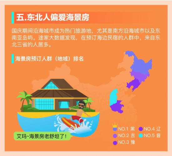 与狗狗也能畅玩黄金周相比,是不是有小伙伴会吐槽自己不如一只宠物狗呢?但如果让你找个“主人”一起出游的话,你知道要找哪里人吗?答案当然是东北人!途家大数据显示,国庆期间沿海城市海景房民宿的预定最多人群,来自东北三省。位列前五位的分别是黑龙江、吉林、河南、辽宁和山西,东三省整整占据三席。如果算上人家带宠物出游,跟着东北人一起过黄金周的宠物,都能面朝大海,春暖花开哦。