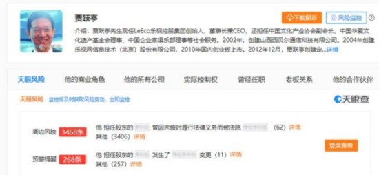 根据天眼查信息显示,乐视控股(北京)有限公司成立于2011年9月,注册资本10亿元,登记地址为北京市朝阳区姚家园路105号3号楼10层1102,法人吴孟,执行董事贾跃亭。乐视控股北京有限公司主要业务与产品是乐视汽车,贾跃亭直接持股92.07%。此外,天眼查信息显示,贾跃亭的周边风险高达3468条,预警提醒为268条。