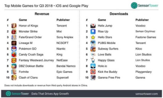 2018年第三季度苹果和谷歌应用店手游营收和下载数据