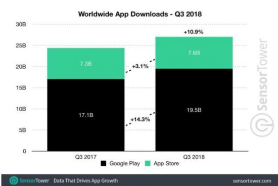 但在应用下载方面,由于新兴市场迅速采用低成本的Android设备,谷歌应用店仍占据着优势。两家应用店的应用程序安装数量都增长了10.9%,达到271亿次,比2017年第三季度增长了24.4%。