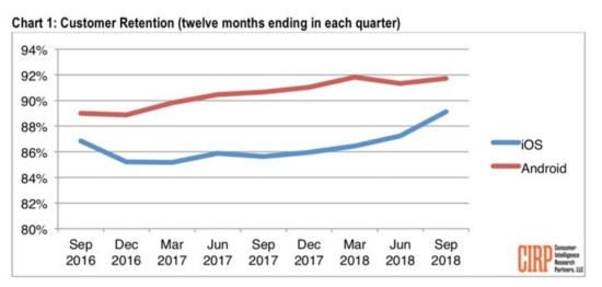 “在过去的两年里,iOS和Android的忠诚度一直在上升,达到我们所见的最高水平,”CIRP的合伙人兼联合创始人Mike Levin说。“基本上,在过去三年中,大约90%的美国智能手机用户在购买新智能手机时仍使用相同的操作系统。”