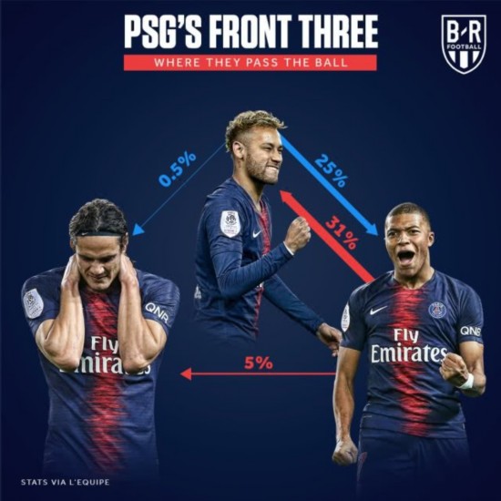 一个数据:内马尔与姆巴佩之间互相传球远高于二人对卡瓦尼的传球