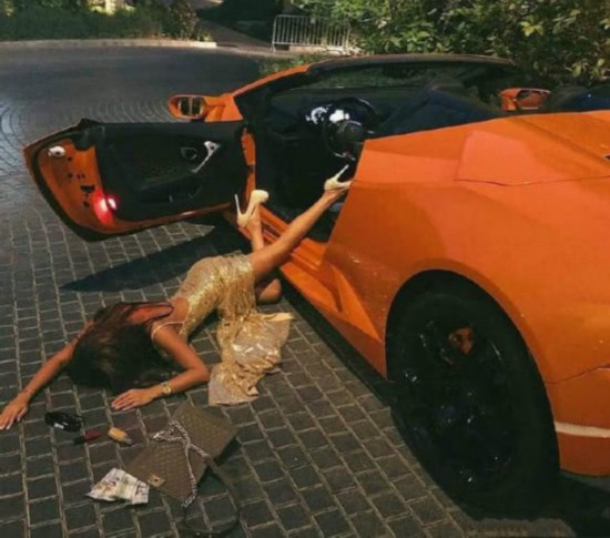 这位网红穿着礼服,打扮的像是要去参加晚会。敞篷车十分的吸引目光,不过从她包包里掉落的东西来看,有点囊中羞涩啊。