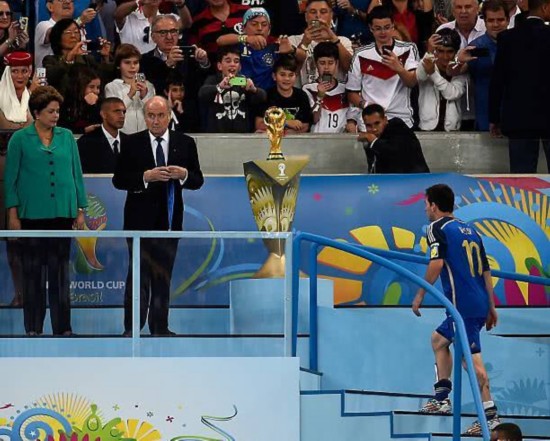 2014年在巴西的决赛,我们输在了最后,那是阿根廷夺得世界杯的最好机会,但很可惜的是它从手边溜走了,这让我一直很痛心。与大力神杯擦肩而过的镜头被记者定格,反复拿来与当年的齐达内来比较。但我们之间的情况是完全不一样的,他是个伟大球员,在1998年已经证明了自己,只不过失去了自己第2次获得冠军的机会。我在世界杯赛场上,还无法达到那种高度,也许永远也没有机会了。决赛能够梅开二度,获得大力神杯,这是多么美好的事情。