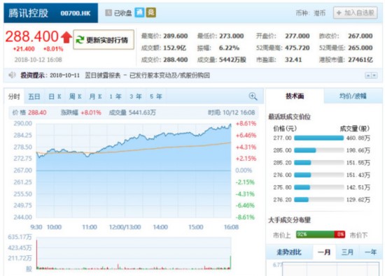 腾讯科技讯 港股今日全线回暖,科网股强势反弹。腾讯控股今日大涨逾8%,创2015年8月来最大单日涨幅,股价报收于288.4港元,市值达27461亿港元。