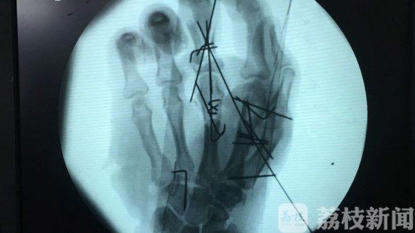 柏大爷被推进手术室进行局部麻醉后,医生对患者清洗伤口,更加细致的检查了伤口,受伤左手手指明显变形,手背大部分皮,左手背约7*8cm的大片皮肤软组织被机器撕脱,且撕脱的皮肤已经破碎,第2-4指掌指骨粉碎性骨折,夏主任立即与团队制定出了手术方案,手术分两次进行,手术从上午进行到了下午,将患者的碎骨一块一块的接上,终于将患者的5个手指全部接上。手术保住患者的左手指,之后根据病人的恢复情况再进行第二次皮瓣手术。万幸的是,经过医生团队近5个小时努力合作,帮助患者保住了左手!