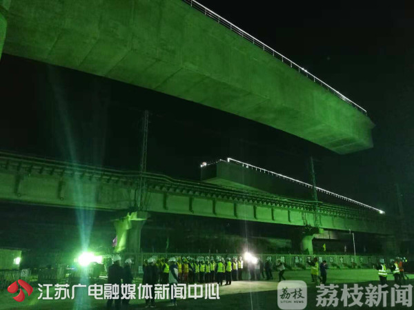 10月11日晚,记者在扬州江都区看到,中铁十四局承建的连(云港)淮(安)扬(州)镇(江)铁路淮扬联络线特大桥半空中灯火辉煌。两个7000多吨的“庞然大物”,同时逆时针旋转19.5度,历时40多分钟后,实现了梁体的精准对接,标志着国内曲线半径最小、距离既有线最近、坡度最大的铁路转体桥成功转体,开创了国内高铁施工的多项第一,施工时间是从11号夜间11点15分到12号凌晨零点28分完成。
