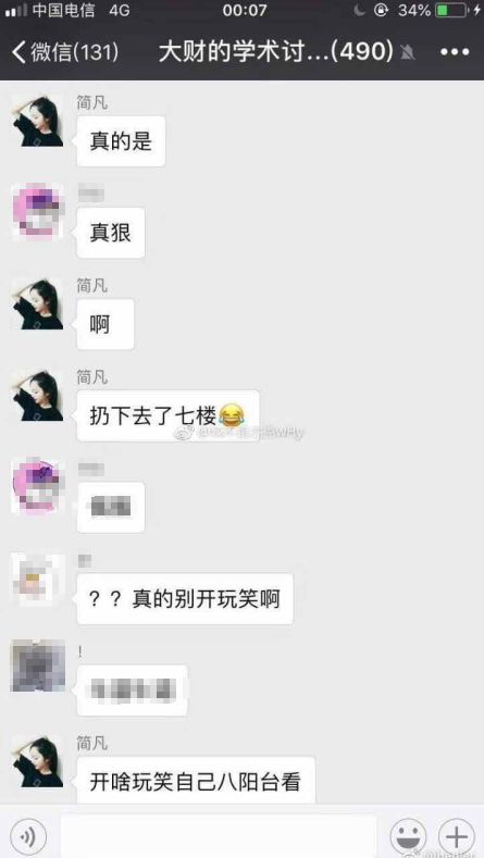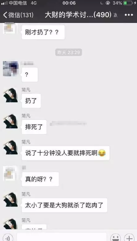 群里有同学对其做法“难以置信”,多次询问讲述是否为真,该男生回复:“说了十分钟没人要就摔死啊”。